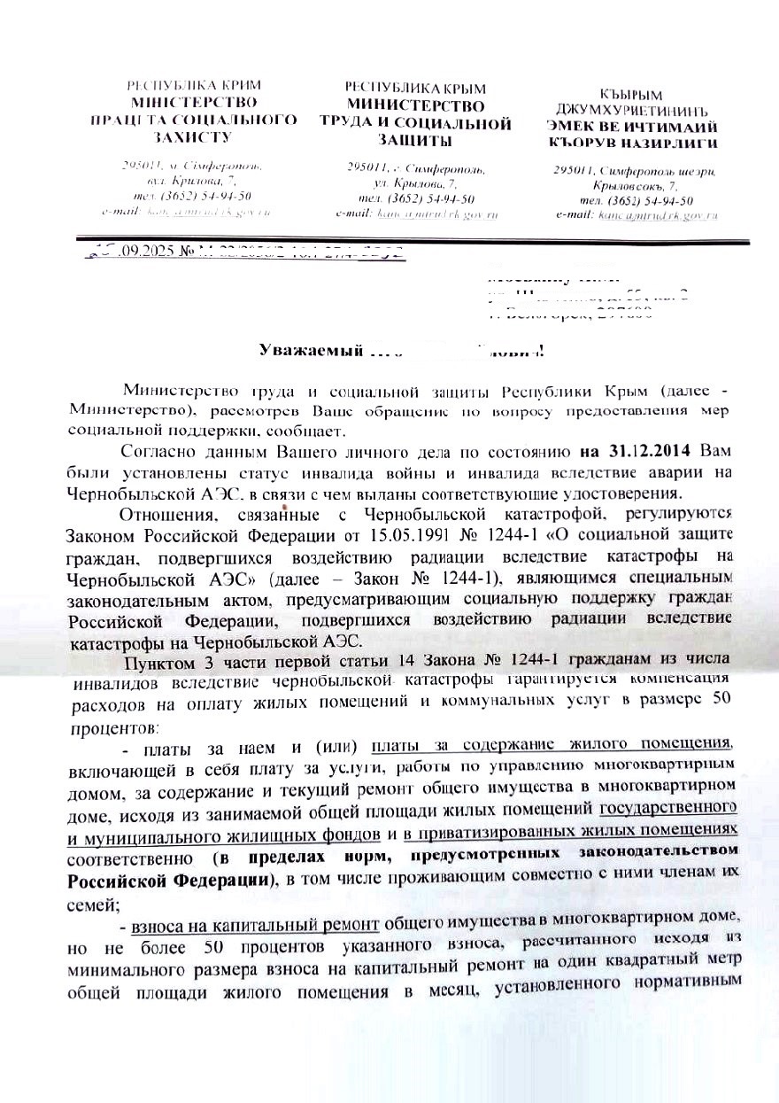 В Крыму установлена единовременная выплата пострадавшим в Чернобыльской аварии...........