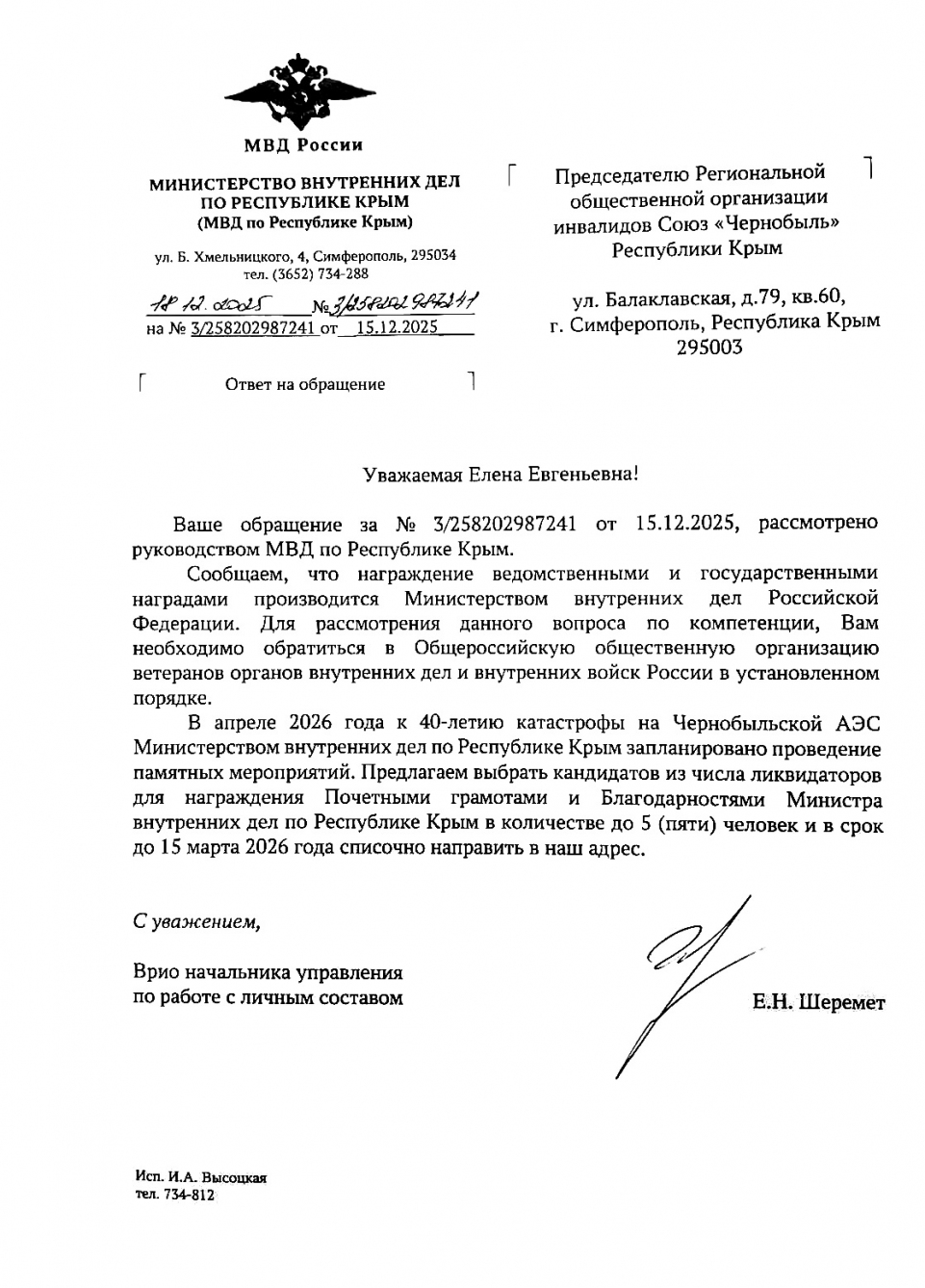 Председатель РООИ Союз "Чернобыль" РК Агапова Е.Е.