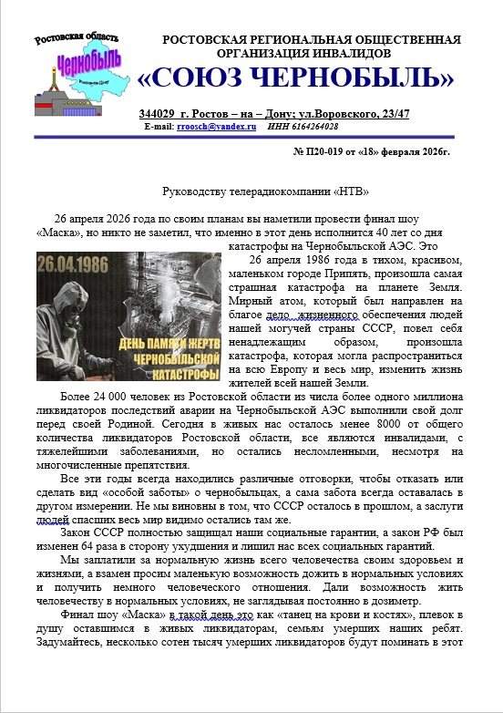 Возможно Вы уважаемые руководители всероссийских чернобыльских организаций, Вячеслав Леонидович, Владимир Александрович прочтете эти строки! Чернобыльская общественность возмущена и считает кощунством проведение увеселительных шоу 26 апреля в 40 годовщину катастрофы на ЧАЭС. В связи с этим, убедительно просим Вас выйти на соответствующие органы с требованием отмены запланированных увеселительных шоу на телевидении в траурную дату.