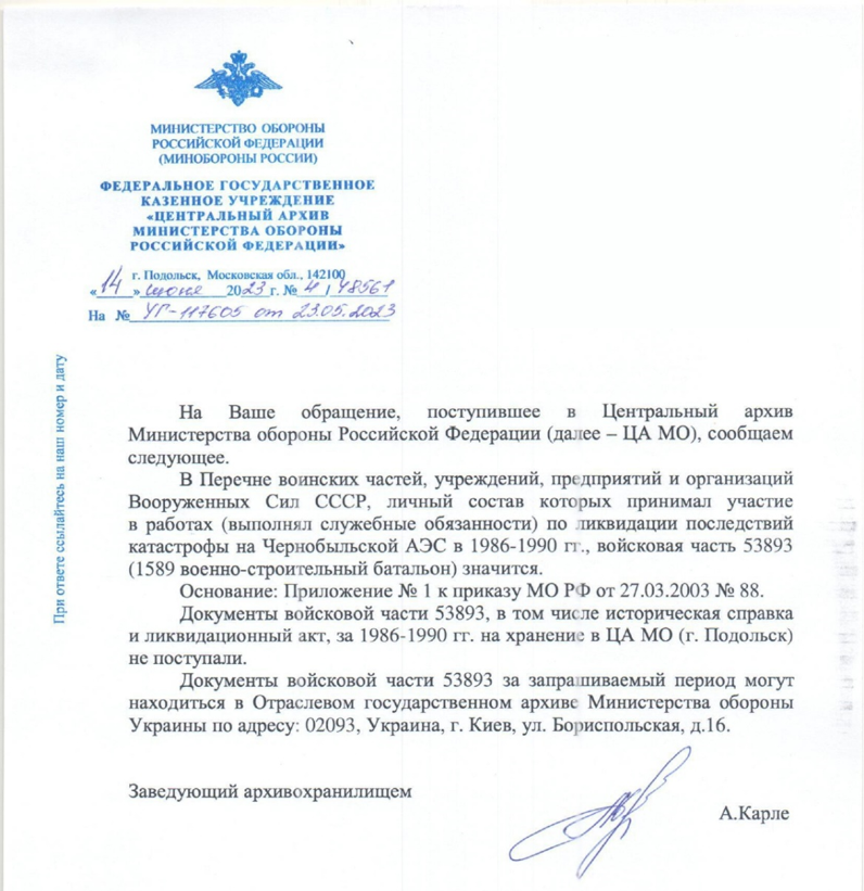 Мне удалось связаться с Юрием Маратовичем. Он пытается найти документы о своей воинской части 13235 за 1986г. Отправил даже обращение в Центральный архив Министерства обороны Российской Федерации, но там их нет. Данные документы могут храниться в Отраслевом государственном архиве Министерства обороны Украины, в г. Киев.